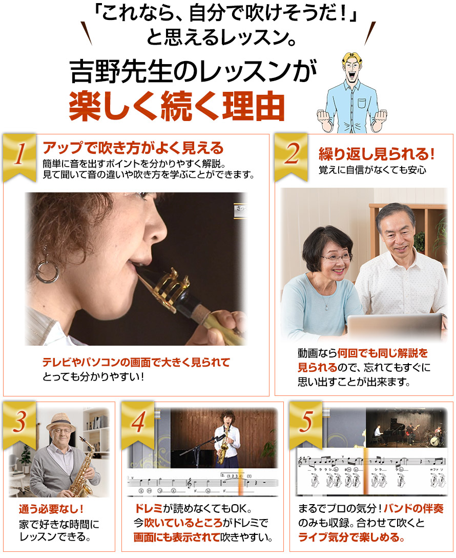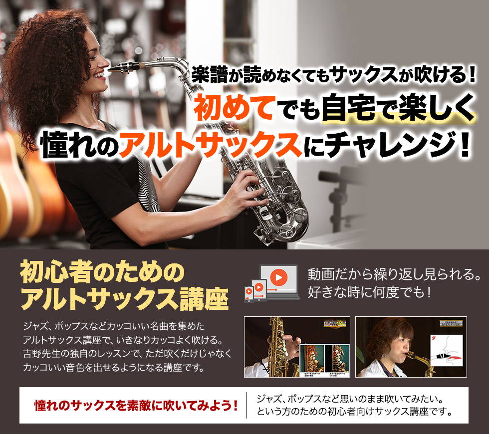 通常、サックス教室に通う場合はレッスン費用や通う時間が必要になります。しかしこの教材なら、自宅で好きな時間にレッスンを受けることができます。